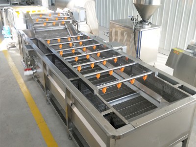 气泡清洗机是大枣,蔬菜,水产生产线中的重要产品,主要用于大枣,蔬菜,水产的清洗。气泡清洗机的原理主要是利用箱体前部分设备箱体中注适量的水,经过加热管将水温加热,原料在经过箱体时,会与气泡机和水的结合作用下做翻滚状态,并随网带不断向前推进,在出水面时,高端设有喷淋头,高压冲洗。
